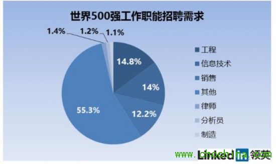 從工作職能分布看,500強(qiáng)企業(yè)中招聘需求最高的前三名分別為工程(14.8%)、信息技術(shù)(14%)、銷(xiāo)售(12.2%)。另一方面,生產(chǎn)制造人員、分析員、律師分別以1.1%、1.2%、1.4%位居崗位飽和的前三名,招聘需求最低。